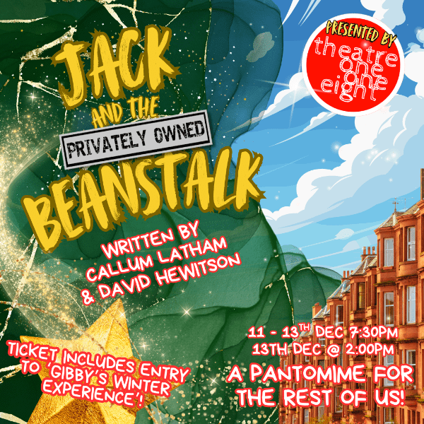 Living in Trongate, Jack and Silly Billy and their maw, Dame Trott, are facing eviction due to the rents being increased by the local tyrant, King Stefan. Both siblings go aff tae sell their coo. So far, so good. They go to market but come back with cryptocurrency, which is thrown out whilst the fairy, who bought he coo for crypto, has cast the spell that grows the beanstalk. On their way they encounter a strolling minstrel with a ukelele they strum who becomes Jack’s love interest. Without the budget for a giant in this makeshift theatre space, we are treated to the bodies being put on trial, found guilty and peace reigning on the people of Trongate thereafter. All done with the usual fanfare of Panto, this, whilst it may have holes in its narrative, makes up for it in infectious enthusiasm.