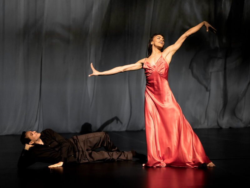 A projection of German film Der Blaufuchs (1938), with its femme fatales and mustachioed cads, has occasional synergy between screen and stage but also distracts. That said, billowing silk becomes visually limiting, even with beautiful lighting, clever hidden swings and embellished by dancers in Marion Cito’s jewel-bright frocks.