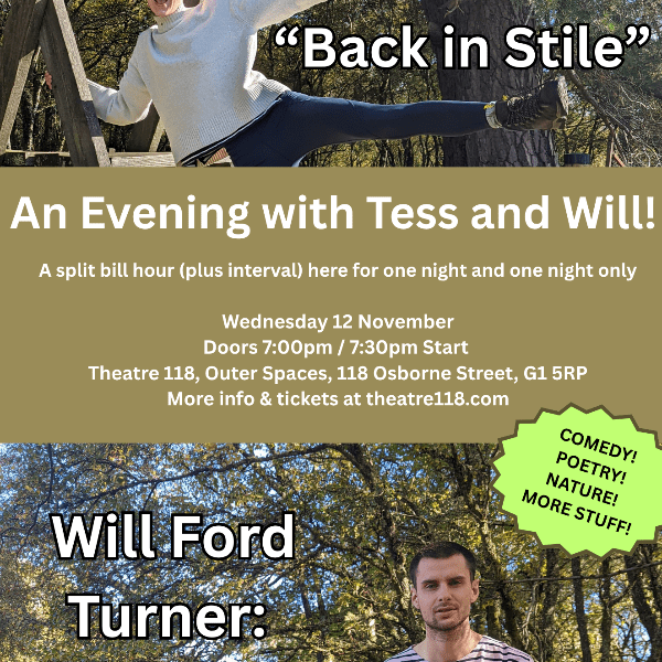 In the second half, Tess Outdoors manages to carry through some of that goodwill into her performance. To be fair it is a more difficult stretch for a performer but the audience on the night were really caught up with her characterisation and performance. Accompanied by a PowerPoint presentation, projected onto the screen at the side worked well enough. Where it needed a little bit more oomph was it needed Tess to have more confidence in her ideas. We could have had less deciduous versus Evergreen and more storytelling. Less beech trees and more the wannabe TV presenter. At times it felt there was a hesitancy which led to slight stumbles. The environment can either be that which excites you or divides a room. Here it had people onboard which could have been more exploited by moving between characters more smoothly, having the confidence to tonally change and vary the pace more. There some really good ideas, technique and skill here. Just need to sell it more to smash it better.